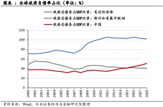 宽松货币政策能够降低政府债务实际成本。2008年全球金融危机、2010欧债危机之后,为刺激持续低迷的经济,发达经济体政府债务水平有了显著上升,中国政府债务2012年以来政府债务比重也不断增长,2018年首度达到GDP的50%。在政府支出难以收缩的背景下,宽松流动性带来的通货膨胀,会在一定程度上降低政府债务实际成本。