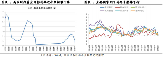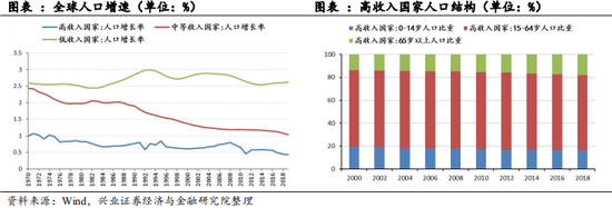 人口增速下行背景下,发达国家持续采用宽松货币政策刺激消费需求。随着经济的发展与人民生活水平的提高,人口增长速度不断下行。就人口增速而言,当前高收入国家人口增速只有0.43%,低于中等收入国家1%的人口增速,低收入国家人口增速虽然较高,但也只有2.63%。全球人口增速由2001年1.30%下降至2018年的1.10%。同时,伴随医疗水平的提高,老龄化问题加剧。高收入国家老龄化率更为严重,65岁以上人口比重由2000年13.67%增至2018年17.93%。