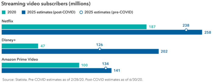 即使消费者在后疫情时代不再沉迷于电视,流媒体的增长趋势仍将继续。对于网飞,亚马逊Prime Video和迪士尼+这样的平台来说,这无疑是好消息,它们将迎来订阅用户数的强劲增长。