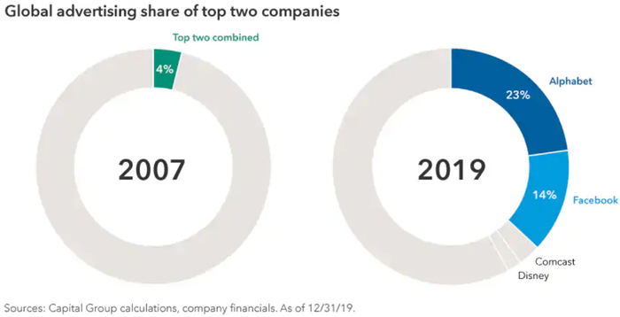 提到数字时代的市场份额,公司规模至关重要,它影响着诸多行业,尤其在谷歌和Facebook控制着37%市场的在线广告行业最为显著。这与2007年的分散市场形成了强烈反差——当时行业前两名市占率之和仅为4%。