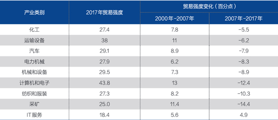 注:贸易强度是指总出口与总产出的百分比。资料来源:根据世界投入-产出数据库,麦肯锡全球研究院资料整理。 制表:于宗文