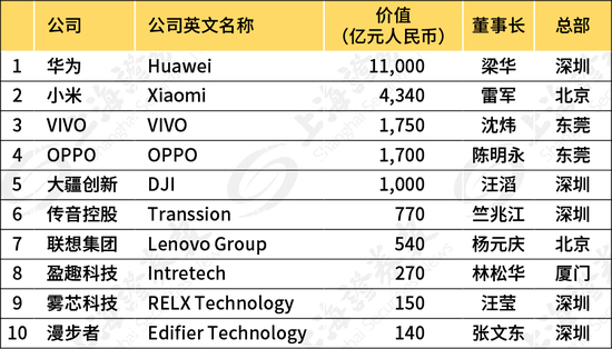 这份10强榜单华为第一、小米第二 A股公司占了三席