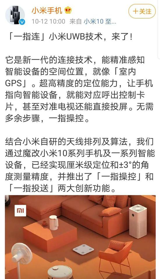 这与小米发布新技术受到关注有关。10月12日上午,小米手机发布,“一指连”小米UWB技术。它是新一代的连接技术,能精准感知智能设备的空间位置,就像“室内GPS”。超高精度的定位能力,让手机指向智能设备,就能对应呼出控制卡片,甚至对准电视还能直接投屏。无需多余步骤,一指操控。