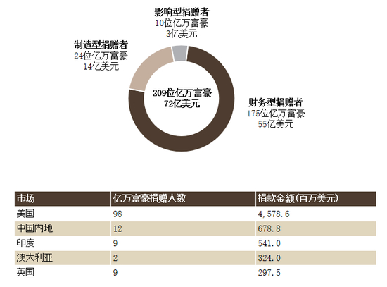 从捐赠的人数和金额上看,美国有98位亿万富豪捐款45.786亿美元,中国内地有12位亿万富豪捐款6.788亿美元。秦政表示,虽然中国内地的捐赠人数和金额,和第一位美国相比有一些差距,但由于中国内地的捐赠者在信息披露方面比较含蓄、谨慎,所以这个数字并不能够真正体现中国内地亿万富豪的捐赠情况。