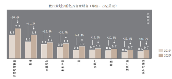 与此趋势相反的是,医疗保健行业亿万富豪的财富在此期间增长10.2%。新技术的快速应用也使科技和工业行业的亿万富豪的财富分别增长了0.8%和4.8%。