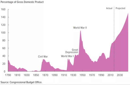 美国国会预算委员会对未来美债占GDP比例的预测