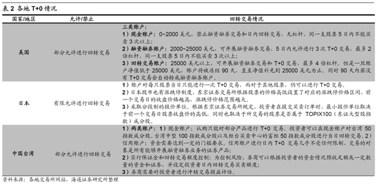 美国和日本经验:投资者分层,现金账户和两融账户对应不同的T+0次数。美国把投资者的交易账户按照规模分成了三组:第一组账户规模小于2000美元,叫现金账户,这种账户的限制很多,不能参加T+0交易,不能参加两融业务,甚至在个股上还有短期买卖次数的限制,超过了会被封号;第二组账户的规模介于2000-25000美元之间,叫两融账户,这类账户可以开展普通的两融业务和衍生品交易,但是只能有限参与T+0业务——5个交易日只能做3次T+0,超过这个次数账户就会被降级成现金账户,两融业务、衍生品业务以及T+0业务也会完全终止,直至90天后解封;第三组账户是第二组账户的升级版,即账户资产规模大于25000美元,且连续5个交易日进行T+0交易 4次及以上、交易次数占总次数的比重大于6%,这样的两融账户就升级为典型T+0账户(Pattern Day Trading)。这类账户权限很高,在T+0交易上没有次数限制。但是门槛也高,一旦账户规模小于25000美元,账户会立刻冻结,即便金额够了,如果90天内没有进行T+0交易,账户也会降级至普通的两融账户,失去无限T+0的权利。日本方面也与美国类似,也是将投资者账户分为现金和两融账户两类:对于现金账户,日本采取了单次双向T+0制度,即当日买入股票再卖出后得到的现金收入不能再操作该股票(可以买别的个股),以及当日卖出再买入个股后该个股不能二次卖出;对于信用账户则采取了无限T+0制度,对交易标的、交易期限和交易次数均没有任何限制。