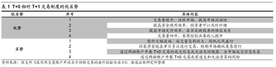 “T+0”与“T+1”的优缺点对比。T+1和T+0制度最大的差异就是能否在当日对同一只股票进行多次的买进和卖出。从上文的分析来看,从T+0到T+1的转变会加大股票市场的波动,投资者参与股票投资的风险会加大,而目前A股波动已经不小。对比A股和发达国家股市的换手率数据,根据世界银行的口径,2019年A股换手率为224%,远高于全世界的均值88%,同为亚洲国家的韩国股市换手率为130%,日本为82%,印度为54%,发达国家中美国换手率为110%,德国为64%,英国为47%。但是与此同时,T+0制度相比T+1制度还是存在诸多优点:首先在T+0制度下,交易具有及时纠错功能。在遭遇市场单边下跌等突发情况时,T+0交易制度使投资者具备了迅速处置当前所持证券的权利,投资者可以迅速止损,最大程度减少损失。而在T+1交易制度下,投资者当日买入的股票,其价格一旦出现剧烈下跌,投资者只能任其下跌,待第二天才能处理;其次T+0交易提高了市场的流动性,提升市场的定价效率。在T+1交易制度下,当日无法卖出的股票无法参与当天的定价过程,无法真实反映股票的供需状况,影响了股票市场的定价效率,不利于投资者对于股票定价形成合理的认知,使得投资者难以看到股票最接近真实的报价,而T+0交易制度下就能很好的解决这个问题;最后,在T+0制度下,股市成交量的提升会使得资金的周转速度也将上升。在T+0交易制度下,投资者可以在当日对其持仓的证券进行调整,卖出和买入其他证券均可进行,相当于同样一笔资金可以多次使用。在资金存量不变的前提下,同一笔资金可以参与到不同的股票交易之中,客观上盘活了市场的资金。而在T+1制度下,投资者当日买入的证券会被冻结,该部分资金在当日只周转了一次。