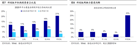 如果从两融账户推进,可以考虑将科创板作为突破口。前文我们叙述从现金账户推进T+0的路径下大盘蓝筹会或成为试点,但是如果从两融账户推进,我们认为科创板或是最优解。今年5月底两会闭幕后,上交所相关负责人就下一阶段科创板改革的重点向证券时报发表观点,表示将“适时推出做市商制度、研究引入单次T+0交易,保证市场的流动性,从而保证价格发现功能的正常实现。”我们认为,科创板是资本市场改革的试验田,再参考海外经验,科创板可以作为目前股票市场中率先试行T+0交易制度的板块。具体而言,科创板有两个特点:第一是两融业务中融资融券两个方向上的力量较为对等。目前A股4000多只个股中仅1800只能开展两融业务,占比45%,其中只有科创板所有上市股票均成为了两融标的。从多空力量的对比看,一直以来我国的两融业务主要侧重在做多的融资端,做空的融券业务余额与融资余额的比值为6:94(截至20201014,下同),但是科创板两融业务的多空力量较为均衡,目前融券余额与融资余额的占比为1:3。海外经验显示,按照账户来分,T+0交易往往在两融账户上展开,目前科创板所有标的均可进行两融业务,且多空力量对比较其他板块更为均衡,后续如果率先引入两融账户下的有限次T+0,科创板是很好的试验田。科创板第二个特点是波动大+机构投资者占比高。前文我们提及大盘蓝筹因波动性小而适合作为现金账户T+0的试点,相比之下科创板的波动性是目前所有板块最大的。但是,考虑到目前科创板的机构投资者占比也明显高于其他板块,我们认为在科创板引入T+0有利于提高机构的资金利用效率,也有利于机构投资者在高波动的市场内及时纠错。科创板的开户条件为20个交易日日均资产高于50万+参与证券交易24个月以上,这一标准明显高于此前A股其他板块的开户条件,而上交所当时预计符合“50万元+2年”条件的个人投资者约300万人,因此科创板散户占比较低。我们用公募基金代表机构投资者来测算A股各个板块的投资者结构,采用基金2020年中报披露的全部持仓个股数据,整体来看,由于今年成长风格占优,中小板、科创板板块中公募基金的占比高于主板,但其中自由流通市值口径下科创板中公募基金的持股市值占比最高,为21%,明显高于创业板的16%,中小板的13%和主板的11%。