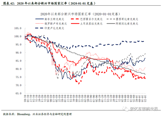 5)汇率:本周美元指数下跌1.0%,摩根大通新兴市场汇率指数上涨0.9%。美元兑人民币汇率跌0.4%,美元日元汇率跌0.7%,欧元美元汇率涨1.2%。新兴市场国家汇率:南非兰特兑美元、俄罗斯卢布兑美元、墨西哥比索兑美元汇率和巴西雷亚尔兑美元汇率上涨,阿根廷比索兑美元、印度卢比兑美元、土耳其里拉兑美元汇率下跌。