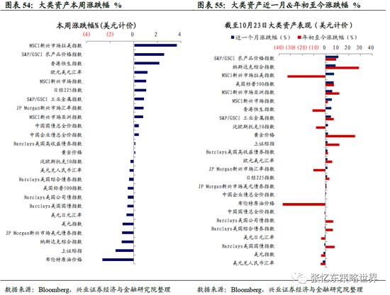 跨资产:股票>农产品>工业金属>黄金>债券>原油;股票市场:本周菲律宾、墨西哥和巴西股市领涨,泰国、中国内地(上证综指)和德国股市领跌;债券市场:本周海外主要发达国家/地区10年期国债收益率均上升,意大利10年期国债收益率上升14.8bp,美国10年期国债收益率上升9.0bp;大宗商品:农产品表现优于工业金属、黄金和原油。本周布伦特原油价格下跌2.7%,黄金价格上涨0.2%;汇率:本周美元指数下跌1.0%。