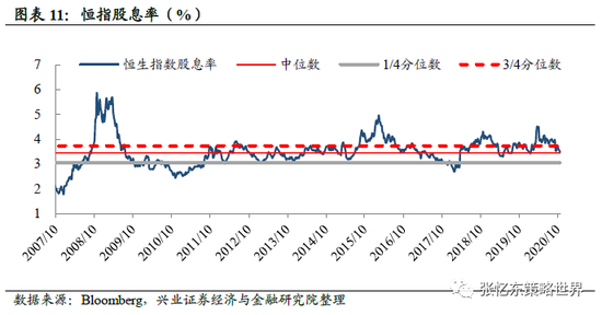 当前恒生指数的股息率为3.48%,低于上周的3.55%,处于2006年9月以来的中位数和3/4分位数之间。