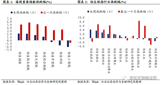 股指表现:本周,恒生指数(涨2.2%)、恒生国企指数(涨2.1%)和恒生大型股(涨1.7%)领涨,恒生综指上涨1.1%,仅有恒生小型股(跌2.1%)、恒生科技指数(跌1.6%)和恒生中型股(跌0.5%)下跌。行业上,恒生能源业(涨4.2%)、金融业(涨3.7%)和原材料业(涨2.7%)领涨,恒生医疗保健业(跌1.4%)、地产建筑业(跌1.2%)和工业(跌0.5%)领跌。