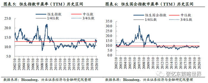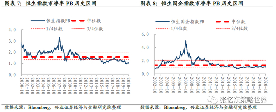截至10月23日,恒指预测PE(彭博一致预期)为13.1倍,处于2005年7月以来的中位数和3/4分位数之间;恒生国指预测PE为9.7倍,处于2005年7月以来的1/4分位数和中位数之间。