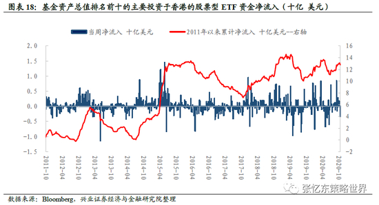 根据彭博口径统计,本周主要投资于香港的股票型ETF基金中,基金资产总值前十大ETF净流出资金3.4亿美元。