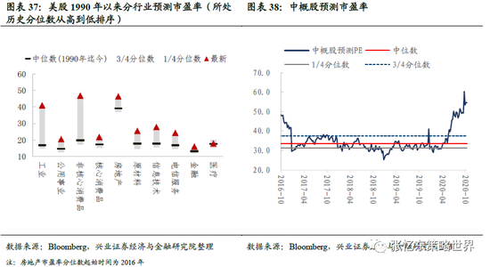 (注:括号内百分比数值为对应行业预测市盈率于1990年以来的分位数)。
