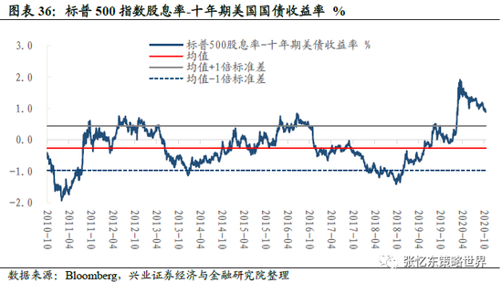 截至10月23日,标普500指数股息率为1.73%,十年期美国国债收益为0.84%,标普500指数股息率与十年期美国国债收益率之差为0.89%,高于2010年以来的均值+1倍标准差,处于2010年以来的相对高位水平。
