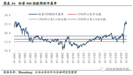 截至10月23日,标普500预测市盈率为25.5倍,略低于上周五的25.8倍,高于1990年以来的3/4分位数。