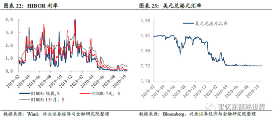 货币市场利率:截至10月23日,相较于上周五,本周HIBOR隔夜利率上升2.2bp至0.07%,7天利率上升0.3bp至0.13%,1个月利率下降5.0bp至0.36%。
