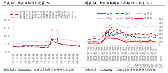 新兴市场信用利差:相较于上周五,本周彭博巴克莱新兴市场主权债信用利差上升6bp至3.5%,彭博巴克莱新兴市场公司债信用利差下降9bp至3.9%,彭博巴克莱新兴市场高收益债信用利差上升1bp至6.5%。