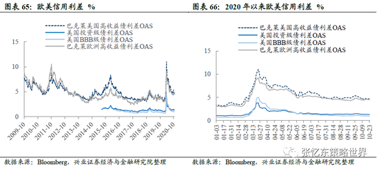 欧美企业债信用利差:截至10月23日,相较于上周收盘,巴克莱美国高收益债利差OAS下降3bp至4.7%,美国投资级债利差OAS下降3bp至1.3%,美国BBB级债利差下降3bp至1.0%,巴克莱欧洲高收益债利差OAS下降9bp至4.5%。