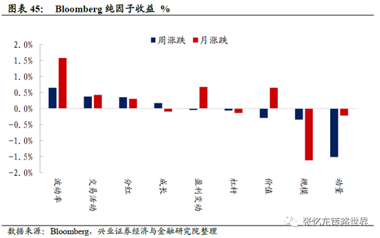 本周,波动率(涨0.6%)、交易活动(涨0.4%)和分红(涨0.4%)因子领涨,动量(跌1.5%)、规模(跌0.3%)和价值(跌0.3%)因子领跌。近一月,波动率因子占优,规模和动量因子跑输。