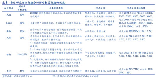 总的来说,我们认为中国经济已处于复苏下半场,但在全球疫情背景下,流动性宽松环境还不会出现根本变化,综合考虑四季度A股机构行为特征,配置方向以顺周期景气为主线,兼顾估值与今年涨幅情况,重点关注:保险、银行、白酒、白电、汽车、苹果链等。