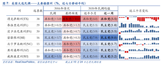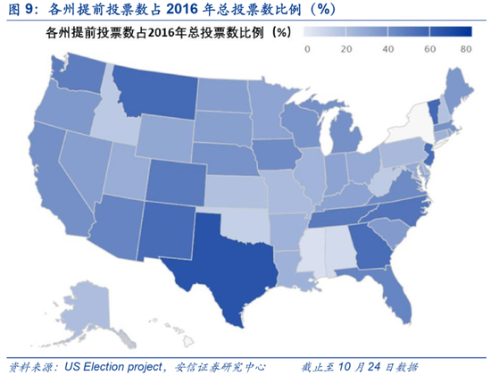 2020年最后一次总统辩论于本周举行,两党候选人就控制疫情、振兴美国家庭、美国种族问题、气候变化、国家安全和领导能力六个议题进行了辩论。不过,由于提前投票占比大幅提高,最后一个阶段的辩论和拉票重要性正在减弱。目前已有近5000万选民进行了提前投票,占16年总投票数近36%;其中邮寄选票数量近3500万,占比近70%(数据截至10月23日)。从主要摇摆州的情况来看,在佛罗里达、北卡、宾州等地,民主党注册选民投票积极性更高。