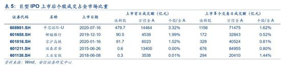 但根据上文分析,蚂蚁集团上市后很有可能出现价格上扬,如果股价上涨30%触发“绿鞋机制”,至91.03元/股—131.47元/股,此时根据超额配售选择权全额行使后的网上初始发行数量加上90%的网下发行数量得到总发行数量55801.538万股,如果这些股份上市当天以110元的交易均价全部换手,预计对二级市场造成613.8亿元的流动性压力,则可超过中芯国际首日成交额。(如果超额配售选择权仅部分而非全额行使,则流动性冲击更小,此处计算的是极端情况。当日交易均价按照我们预估发行价的中位水平估计。)