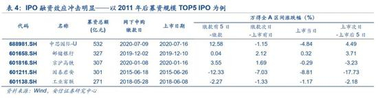 巨型公司IPO往往伴随A股市场调整效应。如果明星公司IPO规模巨大,且前景看好,使得广大投资者有着参与的理由,则很可能在其上市前期和上市当日吸引投资者抛售所持股票,参与新股的打新或在二级市场买入。如果上市当日成交规模巨大带来的流动性冲击更可能诱发市场调整。我们统计了2011年以来募资规模最大的5个IPO案例。回顾历史发现,中芯国际、京沪高铁、国泰君安和工业富联上市当日万得全A分别下跌-4.84%,-0.29%,-8.81%,-1.17%,国泰君安、京沪高铁和工业富联上市五日后的万得全A跌幅达到-17.73%,-3.23%,-2.18%中可以看出,巨型IPO的融资会对二级市场造成冲击。所以投资者容易倾向于认为,蚂蚁集团上市当日带来的持仓配置调整和流动性冲击可能成为诱发市场调整的一大因素,并且很可能已在提前避险。