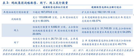蚂蚁集团上市对A股流动性的影响估算。如果蚂蚁集团上市后没有触发绿鞋机制,根据上文我们预估的发行价70.02元/股—101.13元/股,由于战略配售股份被锁定,根据网上初始发行数量加上约90%的网下发行数量得到总发行数量30740.988万股,如果这些股份上市当天以85元的交易均价全部换手,预计对二级市场造成261.3亿元的流动性压力,低于中芯国际首日成交额。