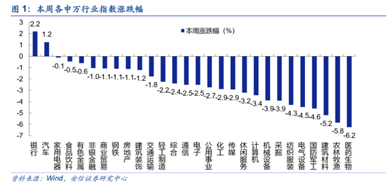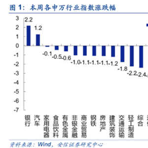本周市场风险偏好下降,上证指数,中小板指创业板指涨跌幅分别为-1.75%,-2.82%,-4.54%。从行业指数来看,本周银行(2.19%),汽车(1.25%),家用电器(-0.12%),食品饮料(-0.46%)、有色金属(-0.60%)等行业表现较好,医药生物(-6.24%),农林牧渔(-5.84%),建筑建材(-5.19%),国防军工(-4.60%),电气设备(-4.48%)等行业表现靠后。