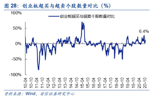 本周大盘表现弱势,个股呈普跌状态。当前市场强势个股数量占比63.0%,较上周大幅下降5.6个百分点,超买个股与超卖个股之差占比1.5%,较前周下降2.6个百分点。创业板来看,强势个股数量占比85.4%,较上周上大幅下降1.2个百分点,超买个股与超卖个股之差占比6.37%,较前周下降4.23个百分点。