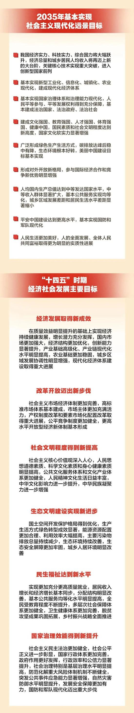 全会提出2035年基本实现社会主义现代化远景目标以及“十四五”时期经济社会发展主要目标。“十四五”时期目标包括: