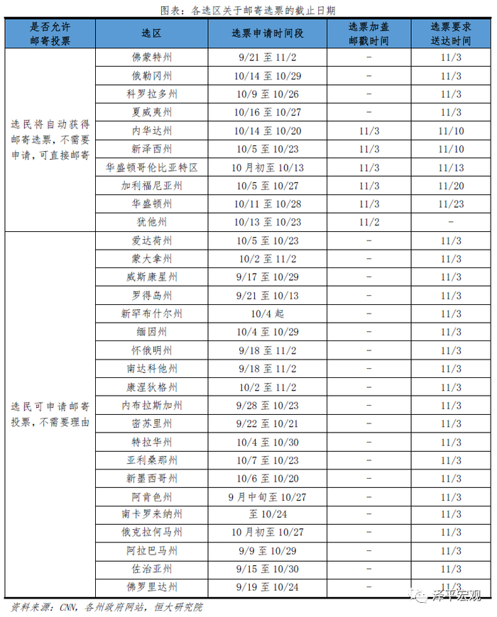 受疫情影响,2020年美国大选投票方式与往届有所差异。第一,邮寄投票申请限制弱化。有10个州的选民可以不通过申请,直接邮寄选票,35个州的选民可以无理由申请邮寄选票。大大提高选民参与选举的热情。第二,延期投票增加。延期投票的目的主要在于避免邮寄投票激增带来的统计误差,当前美国已有25个州确认延期。