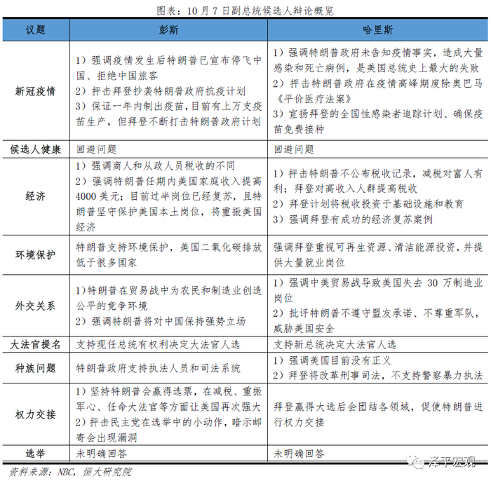 副总统候选人辩论中,彭斯坚持维护特朗普政府在抗击疫情、促进经济和就业方面的努力;哈里斯不断就新冠疫情、经济和外交关系等议题指责特朗普政府,强调特朗普政府是“历届政府执政期间的最大败笔”。
