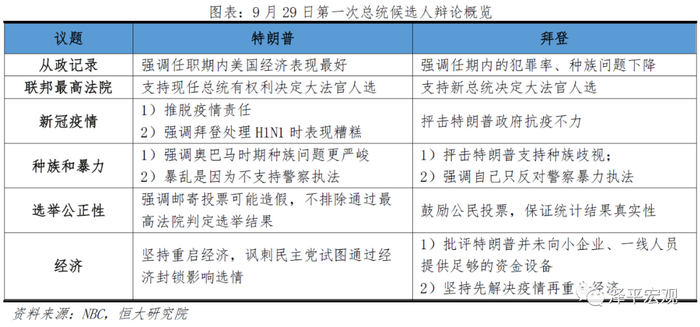 特朗普与拜登在辩论中的阐述与其竞选纲领基本一致。具体来看,1)抗击新冠疫情方面,特朗普试图回避疫情议题,坚持工作重点在重启经济;拜登抨击特朗普政府抗疫不力,强调推出全国性的感染者追踪计划。2)经济与就业方面,特朗普宣扬执政期间的经济政策与成就,包括全面减税、鼓励制造业回流和就业等,承诺为企业提供税费减免,创造1千万个就业岗位;拜登则计划提高对高收入人群的税收、提升最低工资,加大公共服务投资。3)国家安全方面,特朗普坚持重塑军事力量、维护美朝关系,强调“美国优先”,在贸易上打击其他国家;拜登批评单边主义外交政策,希望重塑盟友关系,计划打击干预大选的国家。4)中美关系方面,特朗普继续坚持对进行“不公平倾销和补贴”的国家征收惩罚性关税;而拜登不支持使用关税武器,但也关注“不正当竞争”问题,倾向于通过团结盟友向中国等“贸易政策滥用者”施压。