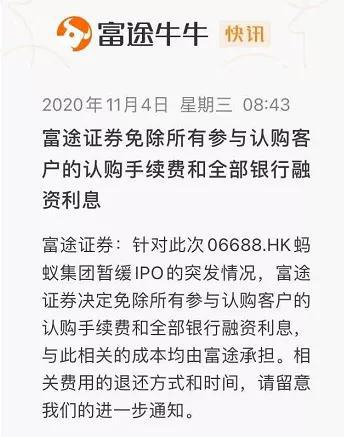 11月4日,富途证券率先表示将退还全部认购手续费和银行融资利息,并承诺与此相关的成本均由富途承担;其后天风国际、方德证券、盈立证券、耀才证券等多家券商纷纷跟进。