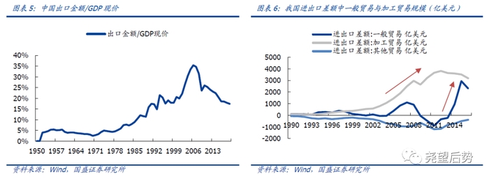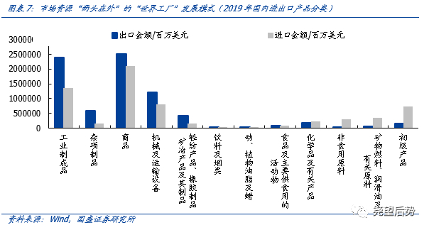首先,逆全球化浪潮下,“两头在外”的“世界工厂”发展模式面临巨大挑战。自我国加入WTO以来,享受全球化红利,以出口导向的国际大循环战略下加速了经济的腾飞。2007年出口金额占GDP比重最高达到了35%,2002-2007年出口同比增速维持在30%上下,中国制造风靡全球。但近些年来,全球政治经济格局正在发生深刻变化,中美博弈不断升级、贸易保护主义再度抬头,疫情加速暴露了全球各国产业链与供应链的脆弱性。由于我国是典型的市场资源“两头在外”的“世界工厂”发展模式,加工贸易规模远高于一般贸易规模,进口多为初级产品、资源、原材料,出口多为工业制成品、杂项产品、商品、机械设备、纺织品等。因此,逆全球化浪潮下,“世界工厂”模式面临严峻的挑战。