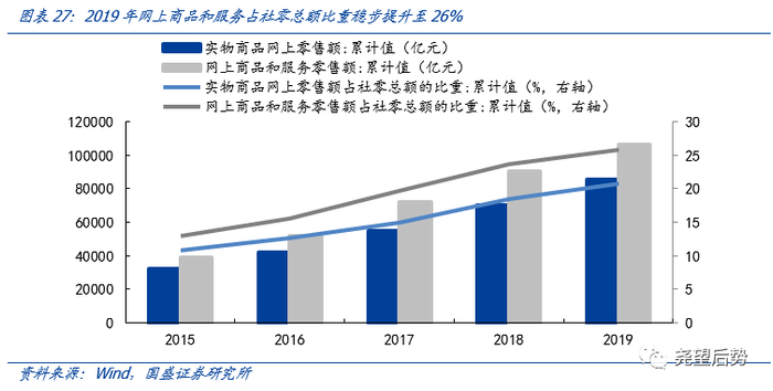新零售作为消费升级的重要部分,成为最具成长性与亮点的消费渠道。互联网渠道降低了商家通过经销商进行线下铺货或自行开线下店的成本,直播电商等途径打造“爆款”,能够迅速提升品牌的业绩和知名度。近年网上商品和服务占社零总额比重稳步提升,2019年达到26%,对社零增长的贡献近半,“十四五”规划更是指出要“促进线上线下消费融合发展”。