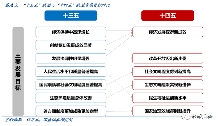 对比“十三五”七大发展目标与“十四五”六大发展目标,高质量发展为主题。第一,经济发展目标,从“经济保持中高速增长”改为“经济发展取得新成效”,更加强调“以推动高质量发展为主题”。第二,“十四五”着重强调“新”,新成效、新步伐、新提高、新进步、新水平、新提升,更加注重全方位的提升,不仅包括在质量效益明显提升的基础上实现经济持续健康发展,更注重发展质量、创新能力、文化建设等软性指标,也更注重国家治理现代化、国防军队等目标。