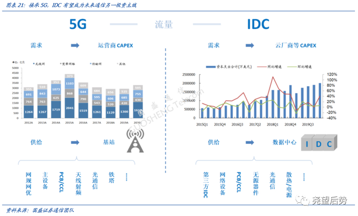 (5)大数据中心(IDC):政策、供需与创新的三重共振下,IDC有望成为通信行业的一条长期主线。供需面上,流量成倍增长,新市场有新格局。5G 时代随着高宽带应用的逐步落地,流量将会以数十倍的量级爆发,同时云计算也加速推进,数据将成重要生产要素。政策面上,数据成为新型生产要素,“新基建”下流量争夺战开启。数据作为新型生产要素写入中央文件,数据对于生产力发展的重要性在不断提升。技术面上,数据中心需求提升带来的不只是量变,IDC 产业链也将迎来创新变化。
