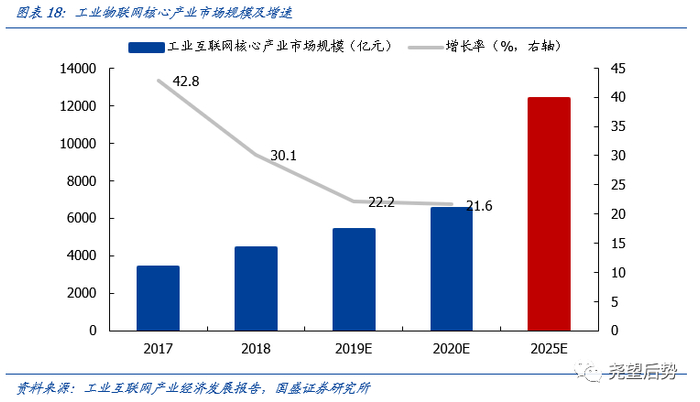 (3)工业互联网:物联网重要应用,智能制造载体,产业数字化途径。工业互联网是物联网在工业场景中最为重要的应用。政策上,今年以来工业互联网发展政策频出,关键在于推动“制造业升级”,并从软件端逐渐拓展到软硬件结合的全领域;据《工业互联网产业经济发展报告》预测,2019年、2025年工业互联网核心产业的市场规模分别可达到5361亿元、1.24万亿元,成长空间广阔。
