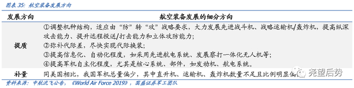 (3)军机:预计空军未来“十四五”的发展趋势仍为主战装备跨代建设,期间复合增速达到20%以上。在新时期战略空军建设目标下,由“防”转“攻”,大力发展先进战斗机、战略运输机/轰炸机,提高纵深攻击能力、远程投送/打击能力和立体攻防能力,弥补代际差,实现代际换装,提高信息化、自动化程度。由此军机发展主要是“补量”和“提质”两个方向,投资方向聚焦于军机总装厂以及军机产业链上游的原材料等方向。