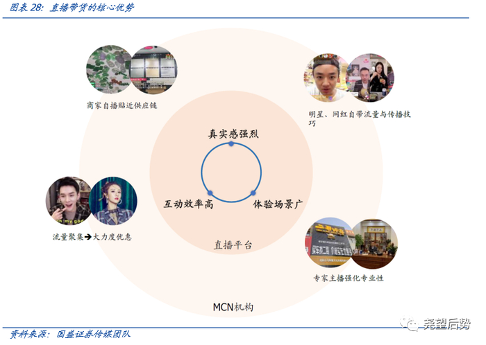 (1)直播带货:市场空间广阔,未来仍将保持快速增长。MCN依靠专业化服务体系和高效率分发渠道保证优质内容有效变现,直播带货是未来发展的重要方向,其GMV呈现出极强的爆发性,且高增长仍可持续,主要原因在于直播带货推动转化与复购,目前渗透率较低,有望进一步增长;各平台仍在持续加大布局投入;直播带货具有非计划性购物特征,通过“种草”与“下单”行为引入新增红利,创造增量消费需求。从产业链分成比例看,平台方与MCN最为受益,有望享受增长红利。