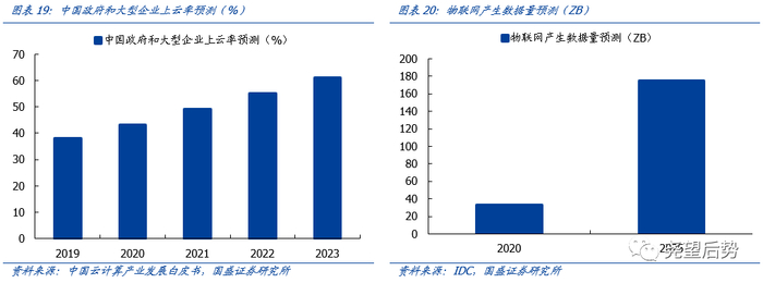 (4)云计算:流量爬升、物联网规模化,驱动云计算高景气。疫情催化与5G的逐渐普及,带来移动互联网流量的快速增长;下游物联网规模逐渐形成,传统产业数字化转型加速,企业上云率、上云程度不断提升,高端制造等新兴产业智能化、数字化程度提升,云计算作为其上游受驱动呈现高景气。