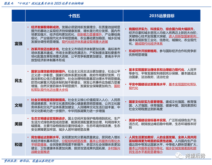 第三,短期目标与远景目标相辅相成,富强、民主、文明、和谐、美丽是共同愿景。第二个百年目标是到二〇三五年基本实现社会主义现代化,到本世纪中叶把我国建成富强民主文明和谐美丽的社会主义现代化强国。“十四五”短期目标与远景目标遥相呼应,相辅相成,均是围绕富强、民主、文明、和谐、美丽五大方向展开,是包容了经济、科技、产业、文化、生态、安全等各个领域的全方位提升。