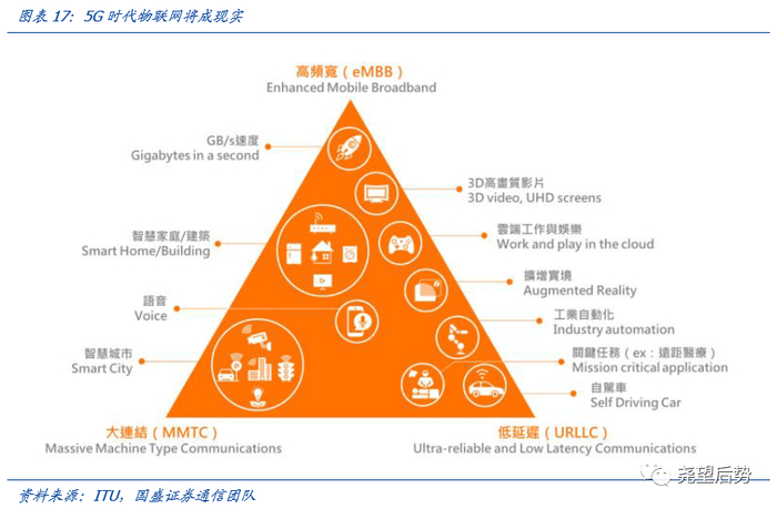 (2)物联网:高度景气带动行业增长迅速;5G应用核心赛道,有望成为新的经济引擎。作为新兴行业,物联网市场规模得到快速发展,据Gartner预测,2020年物联网终端市场规模将达到2.93万亿美元,保持年均25-30%的高速增长。5G等基础设施的完善是物联网发展质变的根基,5G定义了三大场景:大带宽、广连接、低延时。5G网络覆盖不断加速,对于更多物联网场景的孵化意义重大。物联网作为5G应用的核心赛道,有望在5G/IDC的基础设施之上,开启新篇章。