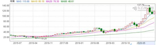▼ 附图:苹果公司过去五年走势图,股价为前复权价