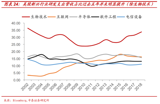 同时,以研发支出占比衡量的美国科技创新能力,与五年前相比,包括互联网、半导体(研发占比15%)、软件及消费电子(12%)等在内的多数科技行业研发支出占比均没有明显的提升,甚至略微下降。